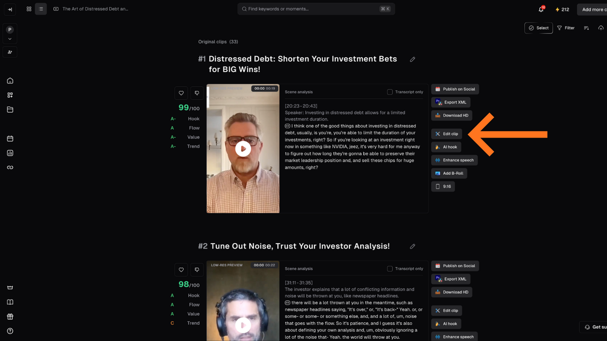 Opus clip selection screen. Click edit clip to start editing.