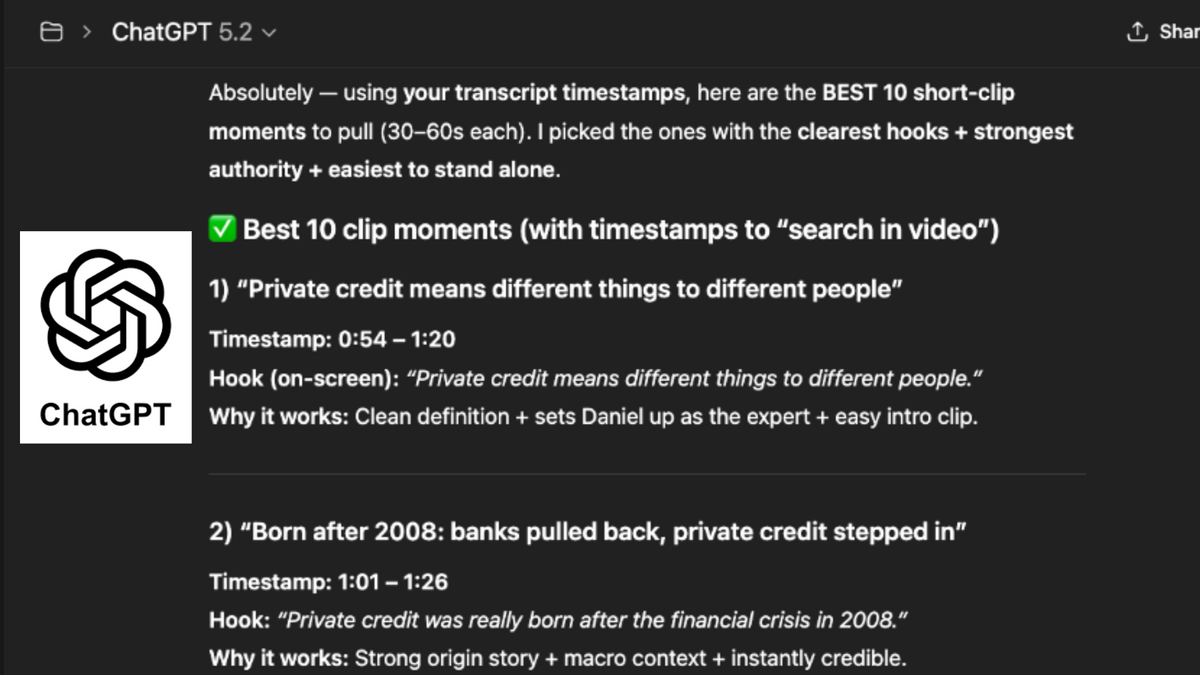 Ask the AI to suggest:- 30–60 second clip moments