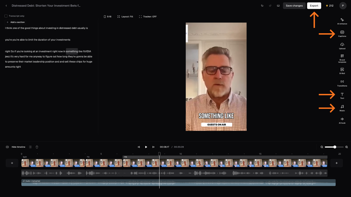 Start editing the clip by adding music, text, and captions. When finished, click Export.