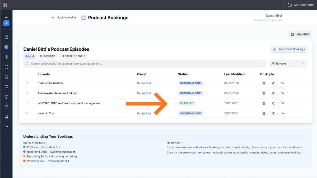 Click Get latest bookings to ensure everything is up to date - Open the published episode link
